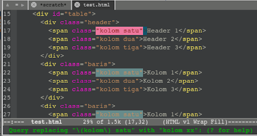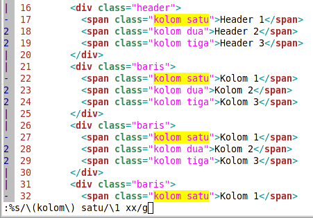 Secara otomatis warna teks yang sesuai dengan karakter Regexp yang kita masukkan akan berbeda dengan yang lainnya, untuk melanjutkan penggantian tekan tombol y, atau !(tanda seru) untuk mengganti semua karakter tanpa konfirmasi.